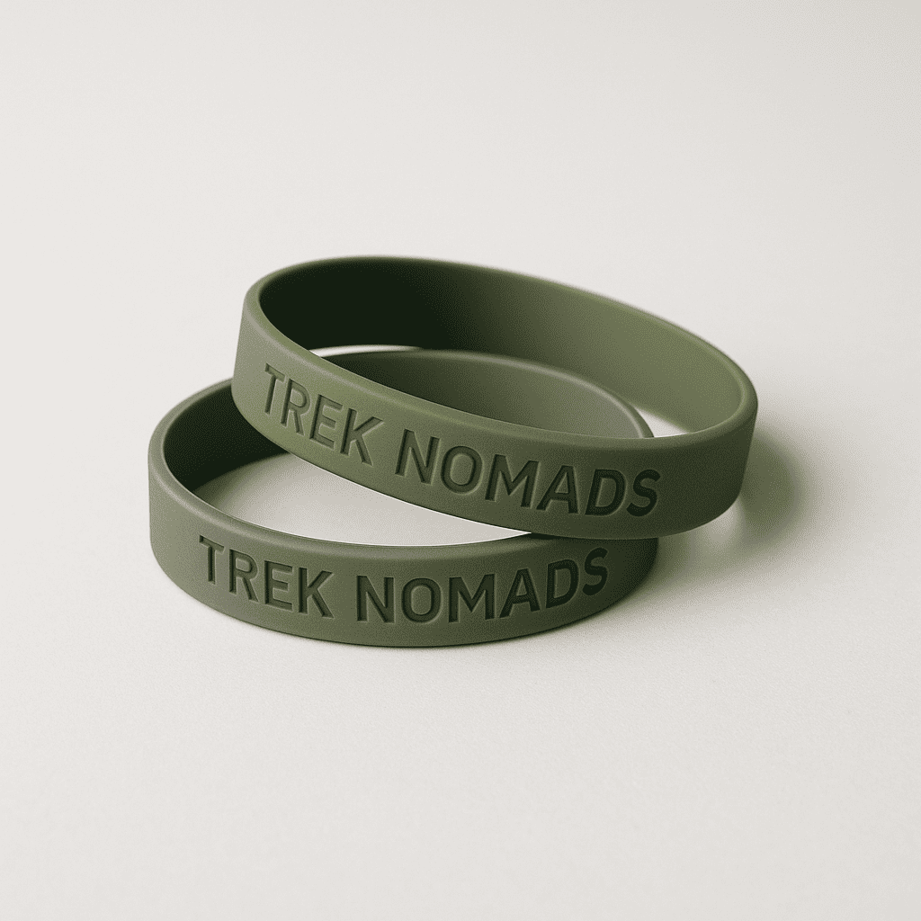 Set of silicone wrist bands in Trek Nomads green and grey. Debossed 'Trek Nomads' text. Lightweight, waterproof, and durable — wear them on every adventure.