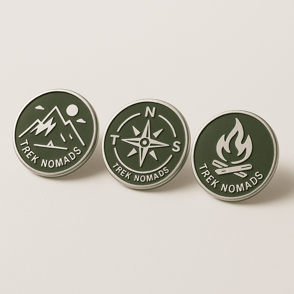 Set of three enamel pin badges featuring mountain, compass, and campfire designs. Attach to your backpack, cap, or jacket to show your Trek Nomads pride.