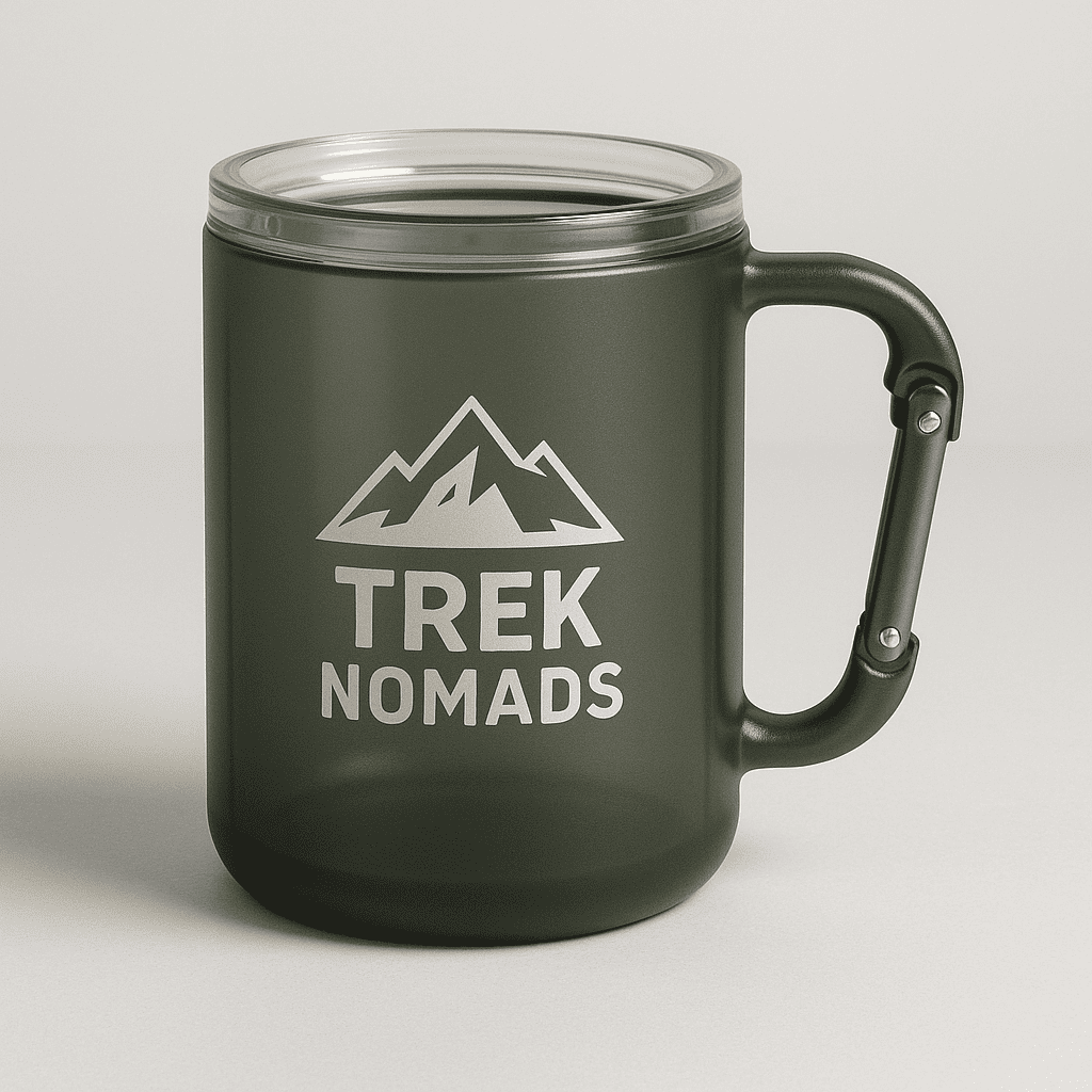 Sturdy polycarbonate travel mug in dark green with the Trek Nomads mountain logo. Features a carabiner handle for easy clipping to your pack. BPA-free and dishwasher safe.