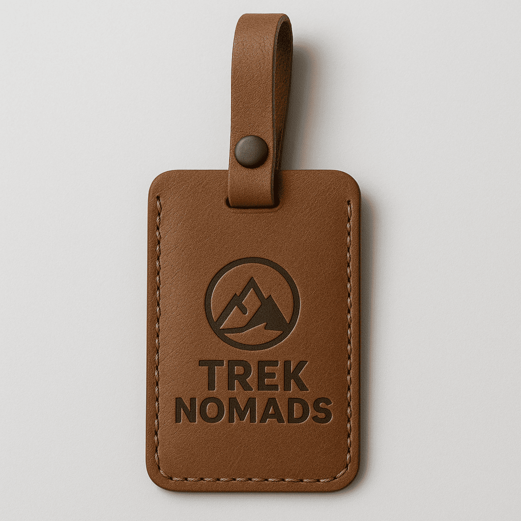 Premium leather luggage tag in brown with 'Trek Nomads' embossed. Clear ID window on the back. Makes your bag easy to spot on the carousel.