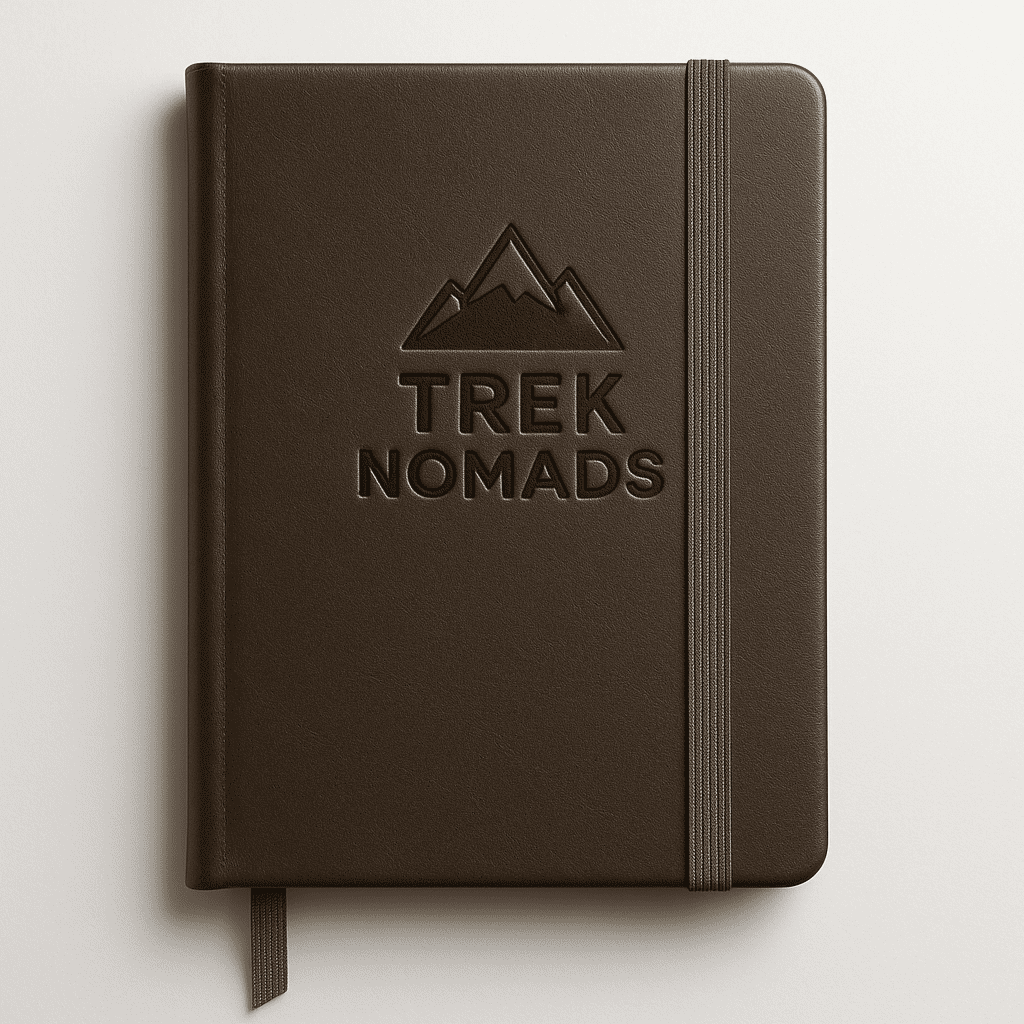 Hardcover travel diary in dark brown leather with 'Trek Nomads' embossed on the cover. 200 pages of acid-free paper. Document your adventures in style.