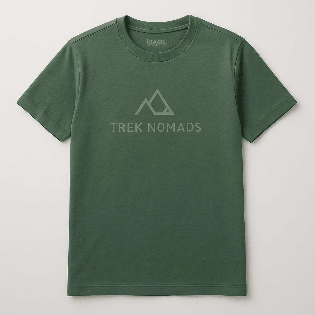 Classic crew-neck T-shirt in forest green. Made from 100% combed cotton for a soft, breathable feel. Features the Trek Nomads mountain peak logo on the chest. Perfect for casual wear or as a base layer on the trail. Available in sizes S to XXL.