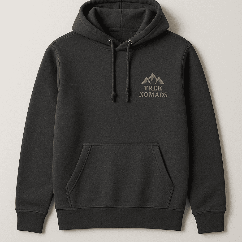 Cozy pullover hoodie in dark charcoal grey. Fleece-lined interior with a drawstring hood and kangaroo pocket. Embroidered Trek Nomads logo. Ideal for chilly evenings at camp or everyday layering. Available in sizes S to XXL.