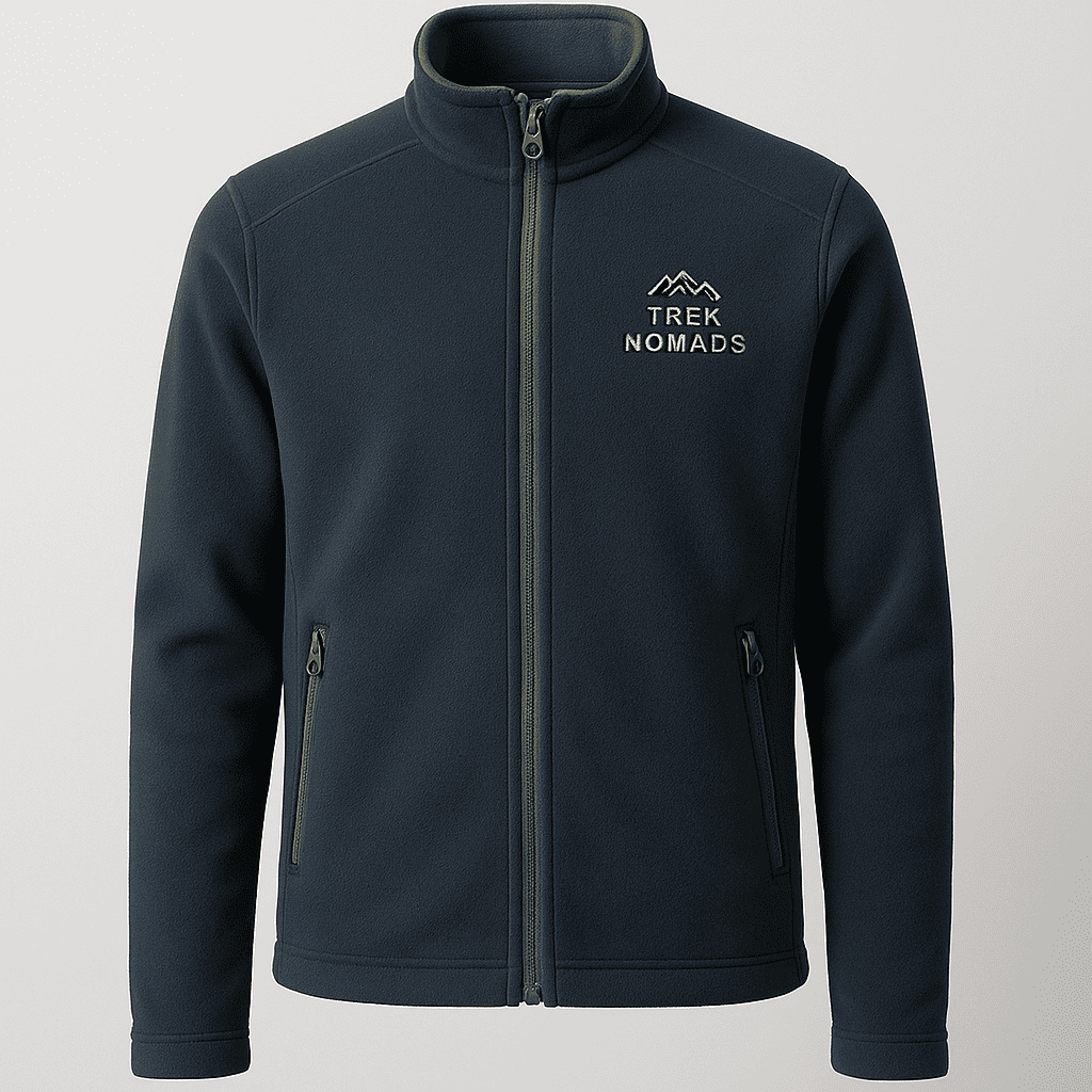 Lightweight full-zip fleece jacket in navy blue. Warm yet breathable with zip pockets for secure storage. Great as a mid-layer on treks or standalone on cool days. Available in sizes S to XXL.