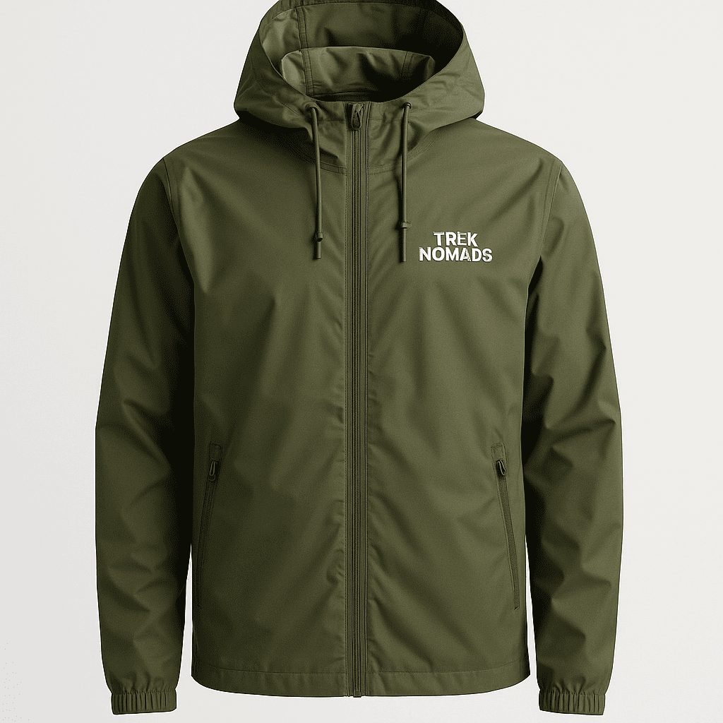 Waterproof and windproof rain jacket in olive green. Packable design with a built-in hood and sealed seams. Essential gear for monsoon treks and unpredictable mountain weather. Available in sizes S to XXL.